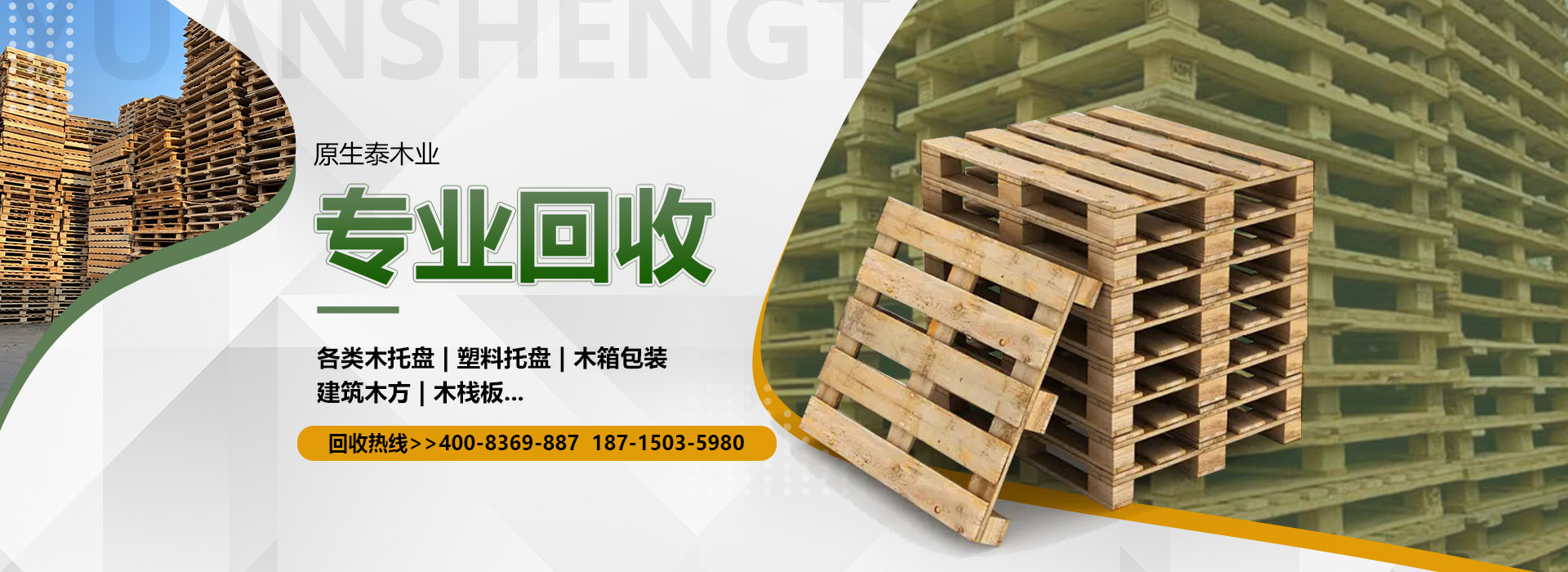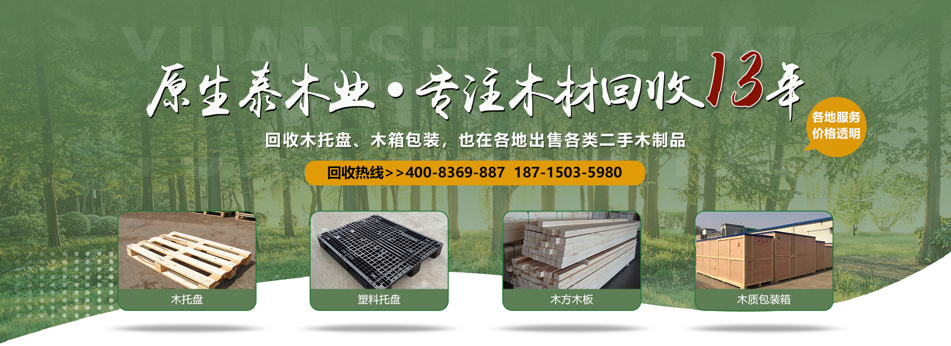 關(guān)于我們原生泰木業(yè)有限公司是一家服務(wù)各市的企業(yè),本公司是以回收各類二手廢舊木材為主,主要回收各類木托盤、塑料托盤、木箱包裝、建筑木方木板、木棧板等等。本公司收購價(jià)格以托盤、木箱木材的規(guī)格、使用情形、新舊程度、材質(zhì)為估價(jià)標(biāo)準(zhǔn),如果您有意向出售您的閑置木制品以及塑料制品,請您聯(lián)系我們時(shí)告知其數(shù)量、尺寸、型式、使用情形,我們免費(fèi)為您提供電話估價(jià)或到現(xiàn)場報(bào)價(jià)。本公司是一家經(jīng)工商局嚴(yán)格注冊的正規(guī)木制品回收公司,回收木托盤、木箱包裝致力于環(huán)保建設(shè)、綠色合作以求雙贏。同時(shí)原生泰木業(yè)公司也對(duì)各地范圍出售二手木托盤、二手塑料托盤、各種二手木制品。及時(shí)送貨上門,價(jià)格公道。公司下轄木材加工廠,組裝廠,并備有大型標(biāo)準(zhǔn)烘房,多功能平板刨,壓刨,挖槽,機(jī)械設(shè)備等。產(chǎn)品主要生產(chǎn)各類木托盤、木包裝箱銷往國內(nèi)大中型城市并隨貨通行出口國外。本公司將以豐富的知識(shí),提供合適的方案來服務(wù)和滿足每一用戶不同的需求,品質(zhì)至上,誠實(shí)守信。